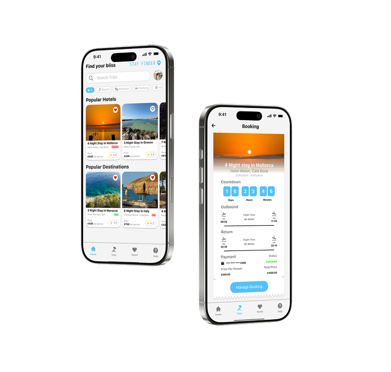 Stay Finder is a concept travel app designed as a UI-focused exploration. The goal was to create a visually polished interface that demonstrates my design style and ability to craft clean, modern, and engaging screens. Unlike my other projects, this piece was not driven by a research brief or problem statement, but instead by the creative challenge of building an elegant and cohesive visual identity for a travel app.